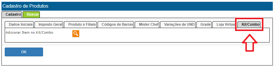 Para cadastrar Kits ou Combos acesse o cadastro de produtos e na guia "KIT/COMBO"