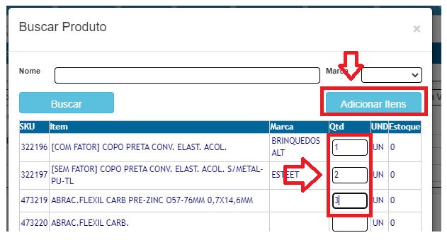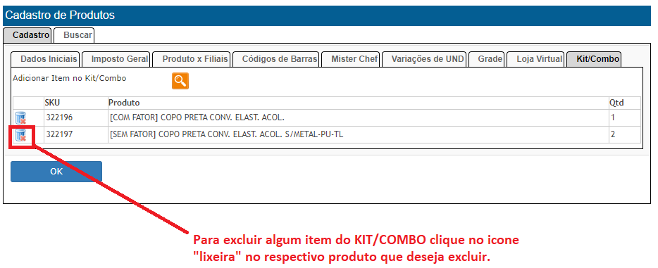 Para adicionar os itens que irão compor o KIT/COMBO clique na lupa para buscar os produtos, realize a busca pelos produtos que farão parte do KIT/COMBO e depois informe a quantidade e vai adicionando