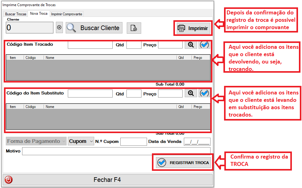 - Caso gere saldo para receber do cliente, depois que finalizar a troca, é necessário fazer o recebimento do valor em FUNÇÕES - F6 e depois ALT + P (que receber valores do contas a receber diretamente no Frente de Caixa)