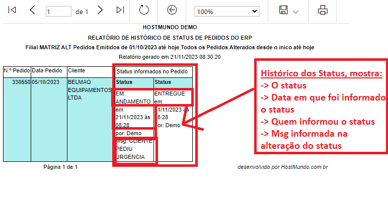 Para você emitir um relatório com histórico de status de cada pedido acesse no menu: RELATÓRIOS > VENDAS > RELATÓRIO DO HISTÓRICO DE STATUS DE PEDIDOS DO ERP