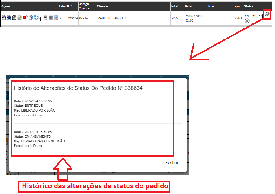 Você poderá consultar o histórido das alterações de status do pedido na listagem de pedidos.