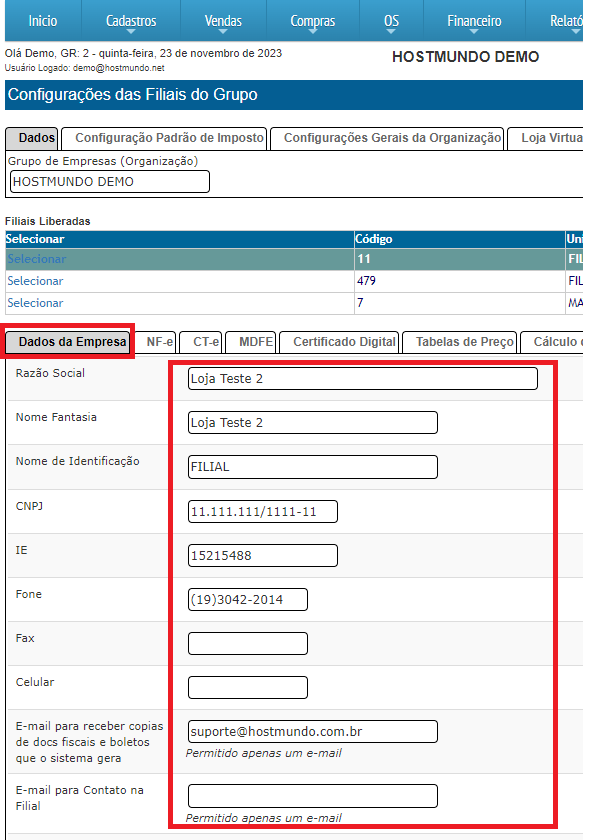 Acesse no menu CONFIG > FILIAIS