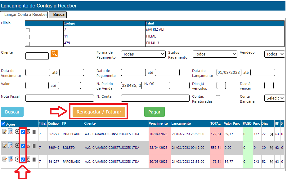 Teremos que unir esses contas a receber em uma única conta e depois inserir esses pagamentos, para isso buscamos pelas contas ou então pelos números dos pedidos de vendas, selecionamos e refaturamos.