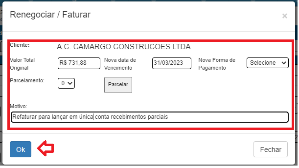 Depois que você clicar em "Ok" e confirmar o refaturamento essas contas irão "sumir" e irá aparecer o novo lançamento em um único lançamento ou as parcelas que vc gerou com um na frente do vencimento: