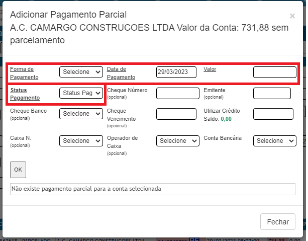 Clique no na coluna "AÇÕES" e na próxima tela adicione os valores de acordo com as formas de pagamento, você pode adicionar vários recebimentos parciais para a mesma conta.