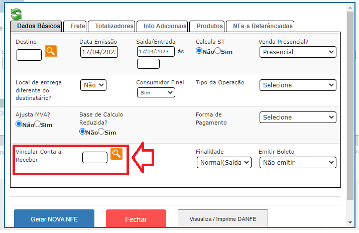 Para vincular uma conta receber na emissão de nfe avulsa quando ela não é feita a partir de pedido de venda, utilize o campo "Vincular Conta a Receber" em "Dados Básicos" depois que informar os itens e clicar em "EMITIR NFE" e busque o lançamento financeiro clicando na lupa de busca que está em: