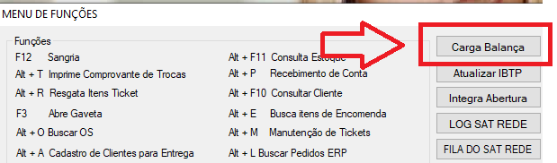 Para carregar o arquivo gerado para a balança acesse o Frente de Caixa, pressione F6 e depois clique em CARGA BALANÇA.