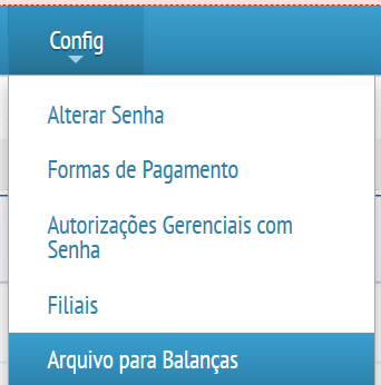 No ERP é necessário gerar um arquivo TXT que irá conter as informações de cada produto (nome, preço de venda e dias de validade), para isso acesse a opção "CONFIG > ARQUIVO PARA BALANÇAS"