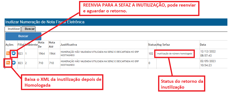 Se você já enviou a numeração para inutilização e não obteve retorno, clique na guia , localize a numeração que enviou para inutilização e poderá realizar ações de reenvio e acompanhar o retorno do envio.