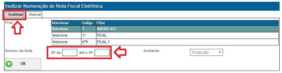 - Número da Nota: caso queira inutilizar apenas um número, exemplo: nota número 10, informe o mesmo número em "Nº de" e em "até o Nº", caso queira inutilizar uma sequencia, exemplo: da 10 até a número 20, informe 10 em "Nº de" e 20 em "até o Nº".