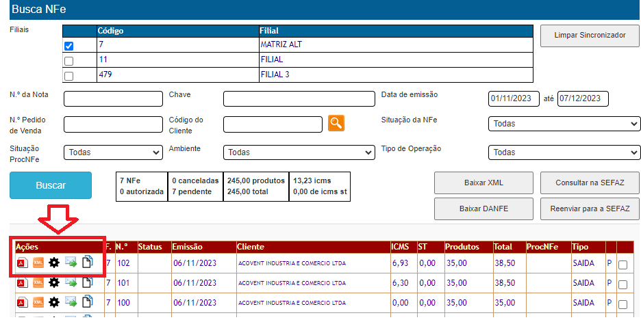 Faça uma busca pelas notas de acordo como filtro desejado, na guia ações na lista de notas encontrada: