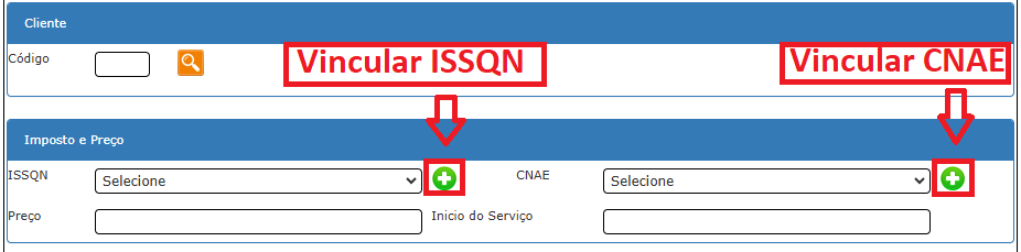 Depois, clique no icone de de qual tipo de imposto você quer vincular, ISSQN ou CNAE.