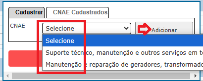 O mesmo para CNAE, selecione qual irá utilizar e depois clique em ADICIONAR, faça isso para todos que irá utilizar, em você pode visualizar todos CNAE que estão vinculados.