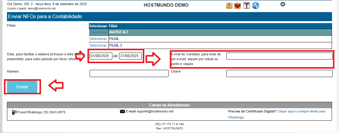 Informe o periodo de datas de qual deseja enviar, informe o e-mail do contador e depois clique no botão