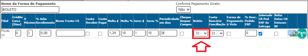 - Acesse CONFIG > FORMAS DE PAGAMENTO e selecione qual forma de pagamento irá gerar boleto automaticamente na emissão do pedido de vendas e na coluna "Boleto" selecione a conta bancária que, a partir dela, serão gerados os boletos bancários quando é gerado o pedido de venda, lembrando que você pode ter varias contas bancárias emitindo boleto.