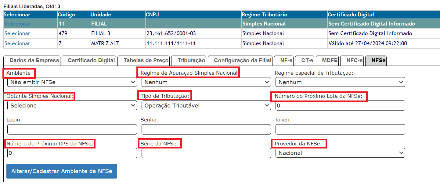 Acesse a filial, em CONFIG > FILIAIS, selecione a filial e informe: